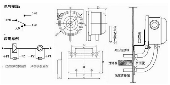 通过旋钮自由设定压差范围,完全满足AHU机组滤网压差报警要求,独特耐高温气膜材料,保证了在微小压差下的灵敏动作,单刀双掷开关,用户可自由选择使用常开或常闭节点,安装简易,顶盖仅需一个固定螺丝,联合支架便于垂直水平安装。媒介温度在-15/+60 ℃范围内。DPS压差开关的生产校准是在室温下,最好也安装在接近室温环境下。湿度较高的系统中可能发生水汽凝结现象,安装时应注意软管连接管口向下。压力连接及接线: 2根塑料管 (P1 和 P2), P1 连接高压端 (标记为“ +”) P2 连接低压端 (标记为“ -”)